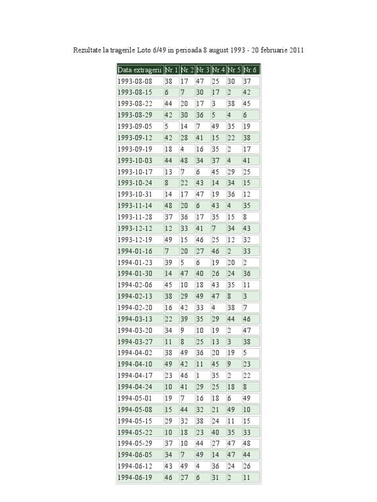 Download as doc, pdf, txt or read online from scribd. Loto, 6/49, joker, 5/40, loto 6 din 49, generator numere, stiri, generator variante, rezultat, rezultate, extragere, noroc, castig, statistici, joc loto, jocuri loto, 6 din 49, arhiva. Rezultatele ultimelor extrageri la loto 6/49 a loteriei române.