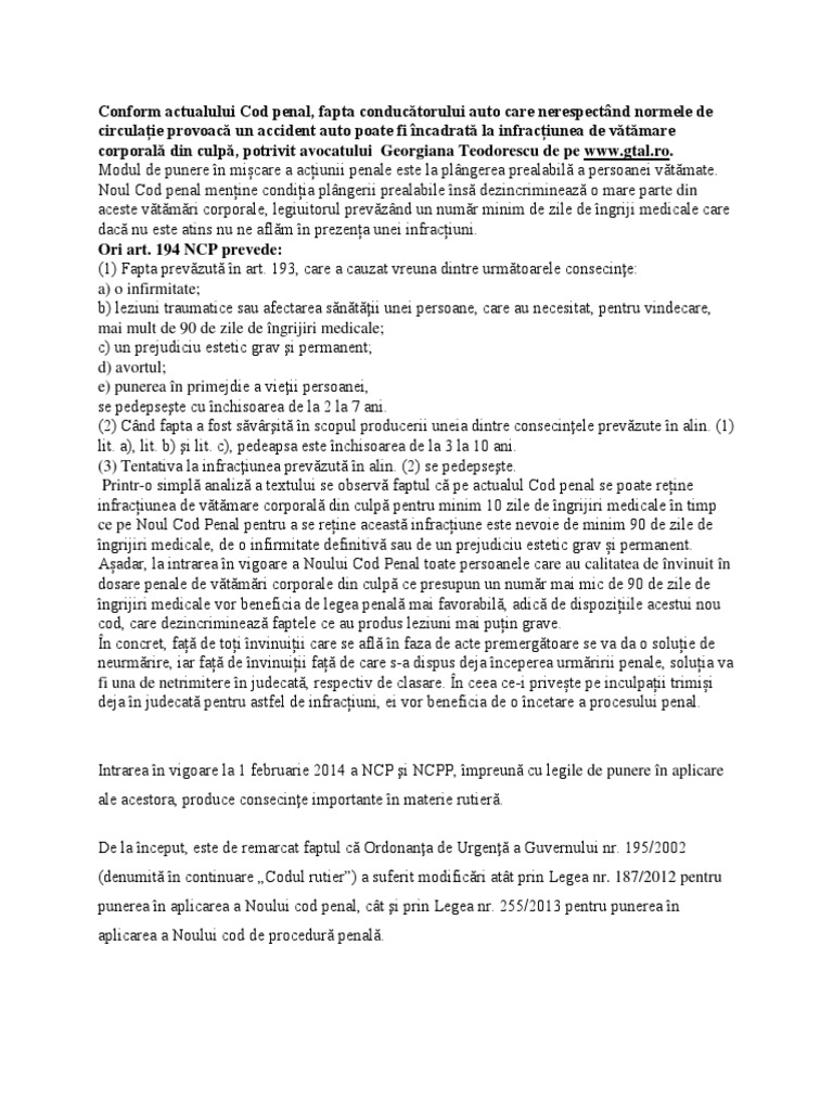 ● noul cod penal (in vigoare de la 1 februarie 2014) ● index alfabetic al noului cod penal ● dispozitii pentru punerea in aplicare a noului cod dispozitiile pentru punerea in aplicare a noului cod penal sunt prezentate sub forma de extras. Victimele trebuie să aibă peste 90 de zile de îngrijiri medicale pentru ca fapta să fie pedepsită penal. Faptele menţionate sunt sancţionate în prezent cu închisoare de la 10 la 20 de ani, iar în noua reglementare vor fi pedepsite cu 3.