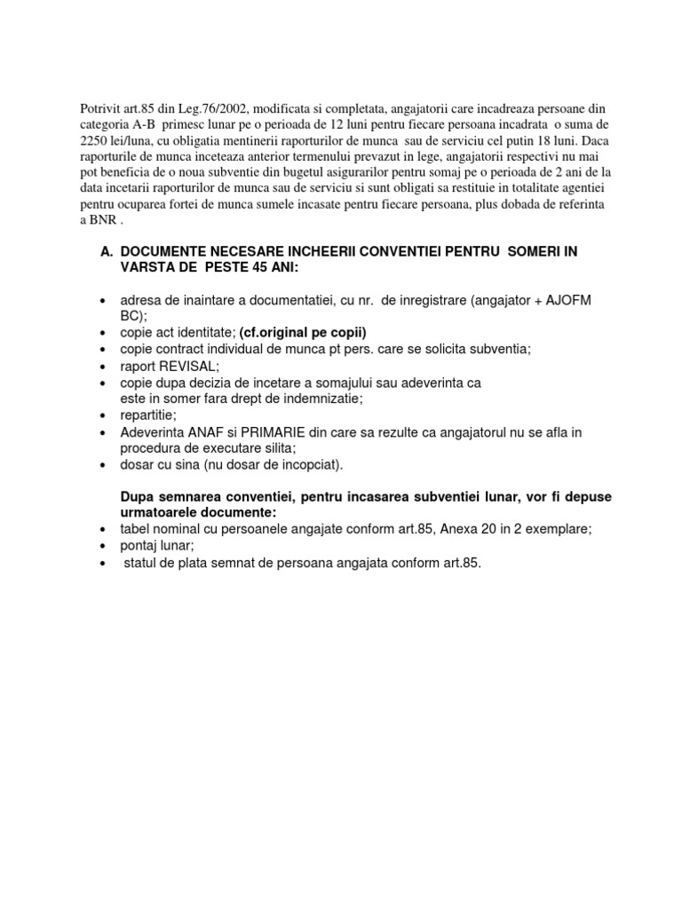 vizitati articolul complet aici : https://ro.scribd.com/document/410782461/Art-85-Acte-Necesare-Someri-Peste-45-Ani „(1) angajatorii care incadreaza in munca, pe perioada nedeterminata, someri in varsta de peste 45 de ani sau someri care sunt parinti unici sustinatori ai familiilor monoparantale primesc lunar, pe o perioada de 12 luni, pentru fiecare. Pentru a beneficia de aceste subventii acordate din bugetul asigurarilor pentru somaj este necesar ca in primele opt luni ale anului 2015, ca urmare a aplicarii masurilor prevazute in programul de ocupare a. Fluturas ,art 85,someri peste 45 ani.docx.